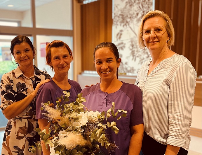 DGKP Kerstin Müller ist seit 5 Jahren Teil des SeneCura Pflegeheims Wolfsberg. Mit ihrer herzlichen Art, ihrem Humor und ihrer Hilfsbereitschaft ist sie nicht nur ein echter Teamplayer, sondern auch für niemanden aus dem Alltag wegzudenken. Das gesamte Team – besonders Pflegedienstleitung Monika Kainz und Hausleitung Cornelia Ozwirk gratulieren ihr herzlich zum 5-jährigen Jubiläum!